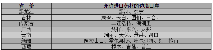 黑龍江省黑河、東寧,吉林省集安、長白、圖們、三合,內(nèi)蒙古自治區(qū)二連浩特、滿洲里,廣西壯族自治區(qū)憑祥、東興、龍邦,云南省瑞麗、天保、景洪、河口,新疆維吾爾自治區(qū)阿拉山口、霍爾果斯、吐爾尕特、紅其拉甫,西藏自治區(qū)樟木、吉隆、普蘭等共22個邊境口岸作為中藥材進(jìn)口通關(guān)口岸。
